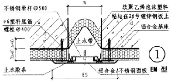 外墻變形縫(金屬蓋板型)EM 金屬蓋板型外墻變形縫——采用滑桿確保變形縫裝置變位時仍能保持中心及原有位置。 型號:EM,E-EM,SEM,EFM,E-EFM,SE-EM ◎ 50%位移量; 滑桿的設置確保變形縫裝置平穩變化; 優良的雙重防水性能,保護建筑; 面板可選用鋁合金、不銹鋼板或黃銅。